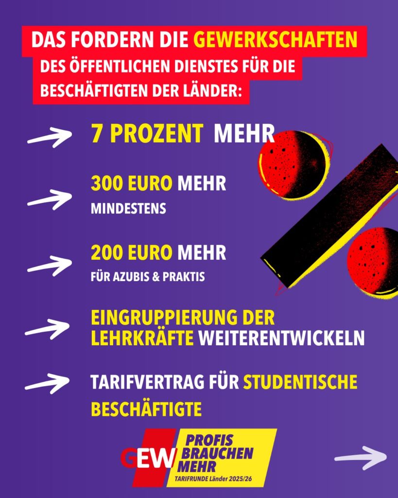 Die Tarifrunde für die Beschäftigten des öffentlichen Dienstes der Länder hat begonnen. Und wie immer: Die Arbeitgeber lehnen alles ab. Sind ihnen die Beschäftigten nichts wert? Haben sie nicht begriffen, wer die Folgen des Personalmangels an den Schulen auf seinen Schultern wegträgt? Ist Ihnen gute Bildung egal?