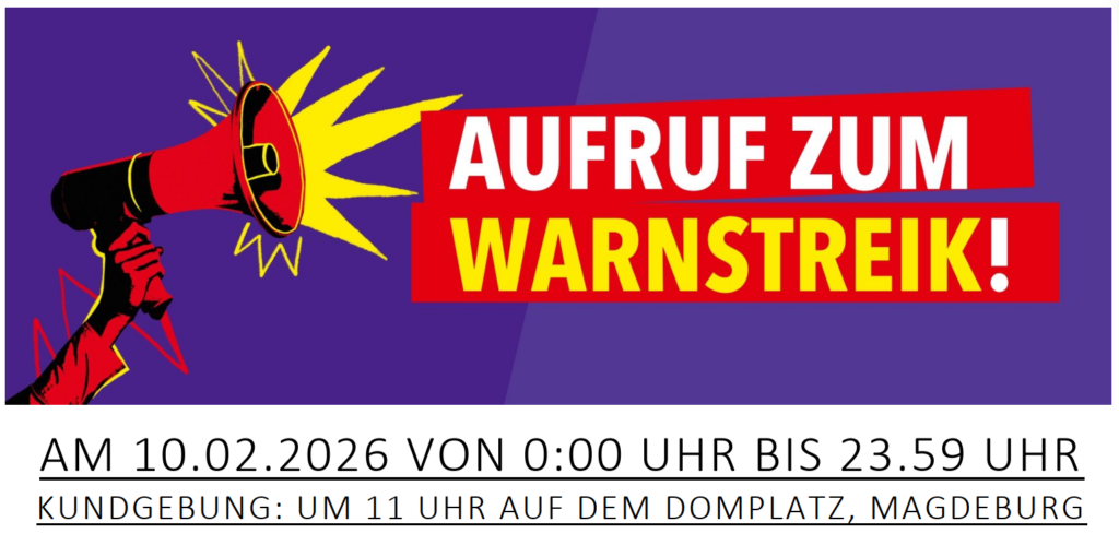 Wir rufen die Mitglieder im Geltungsbereich des TVöD im Norden Sachsen-Anhalts (Kreise: Salzwedel, Stendal, Börde, Jerichower Land, Harz und Magdeburg) zum ganztägigen Warnstreik auf.